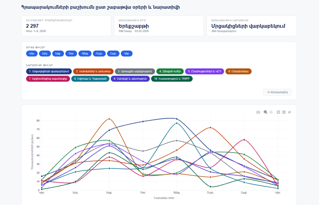 Փետրվարի առաջին շաբաթում ձևավորված նարատիվների դինամիկան ցույց է տալիս, որ խոսքն ուղղակի տեղեկությունների տարածման մասին չէ, այլ 2026 թվականի հունիսին կայանալիք խորհրդարանական ընտրություններին ընդառաջ ստեղծվող ուղղորդված արշավների։